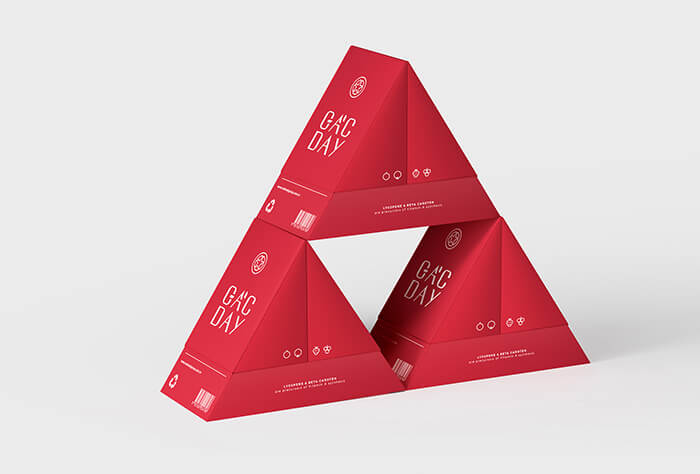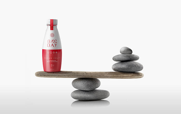 Gacday是一種每日營養飲料,是專門為減輕體內健康、保護心血管系統、促進細胞再生、增強免疫系統而研制的。其豐富的成分,包括強大的抗氧化劑-維生素和番茄紅素有助于預防癌癥,而β-胡蘿卜素有助于改善視力和皮膚健康。排版和內容被選擇為清晰和突出的白色顯示在紅色背景。瓶子是由回收塑料制成,適合從歐洲到越南,再到B2B渠道運輸、保存。